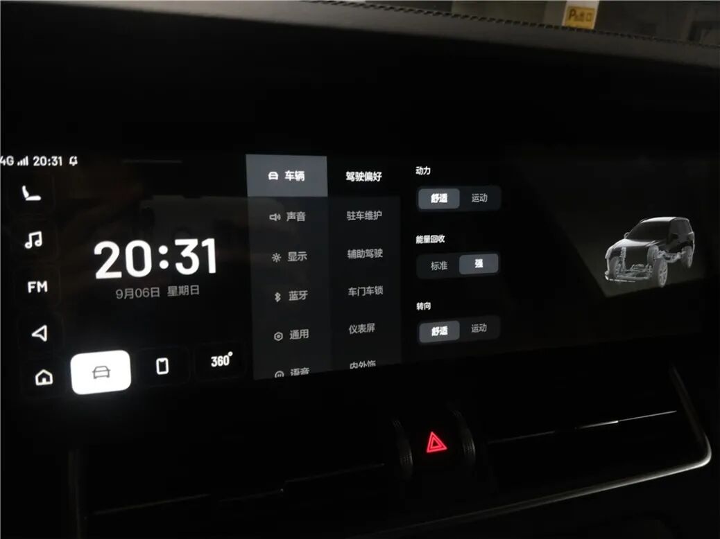 动力方面的调节功能也很多样化。首先,包括动力输出、动能回收、转向、悬架,在主屏上都有两档调节功能。舒适模式下的动力输出有着不错的线性度,但是运动模式下,油门介入时车子有点冲,加上悬架偏软,感觉拉不住庞大的车身,所以如果频繁加减速的话会有点晕。