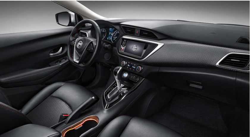 内饰方面依然是日产家族化设计风格,棱角分明,副驾驶前方的面板营造出了类似碳纤维的视觉效果。