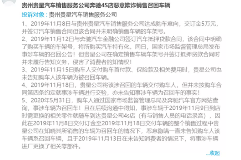 近日,一贵州车主向媒体投诉“贵州贵星汽车销售服务公司奔驰4S店恶意欺诈销售召回车辆”。