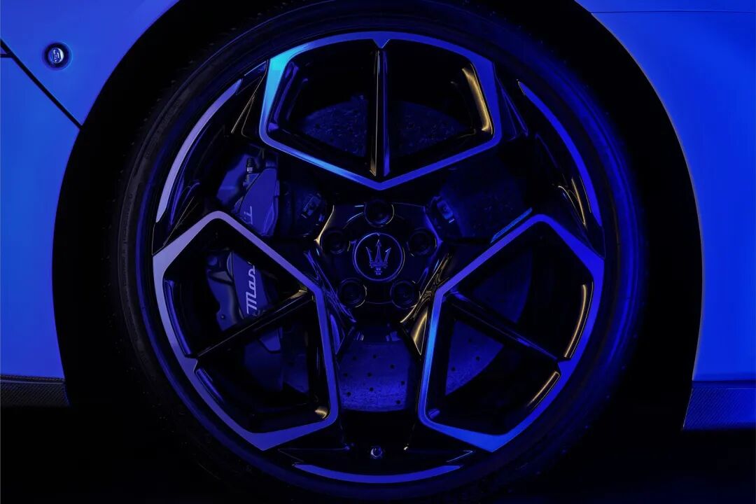 车辆发动机舱盖上的散热口为“三叉戟”造型,我个人非常喜欢这样的设计,玛莎拉蒂把一个单纯的功能性部件变得更有意义。20英寸轮圈搭配蓝色制动卡钳视觉效果非常动感,这套轮圈的设计灵感来自玛莎拉蒂GT,前六后四的碳陶刹车系统保证了强大的制动性能。