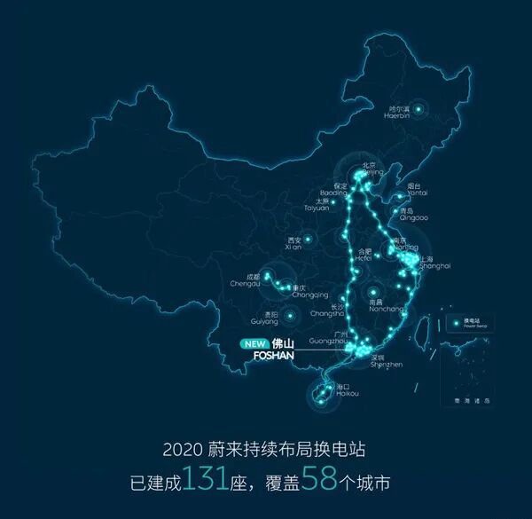 截至2020年7月8日,蔚来换电站的总数共有131座,涵盖全国58城市。蔚来目前在全国的布局主要集中在华东、华南地区,除了新疆、西藏地区外,换电站已将其余的城市都串联起来了。此外,蔚来副总裁沈斐透露二代换电站电池数量会增加到8块电池(第一代换电站5块电池),换电时用户无需下车,大概在2021年春节前后将与用户见面。