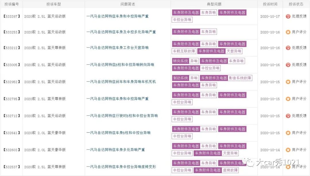 从今年上半年起,车质网、阿特兹论坛和车友群就爆出2020款马自达阿特兹出现了包括B柱、C柱、后尾箱在内的多项车身部件存在异响问题。从车质网目前的投诉信息来看,问题集中在半年内购买的新车上,甚至有车友在提车当天就发现了异响问题。