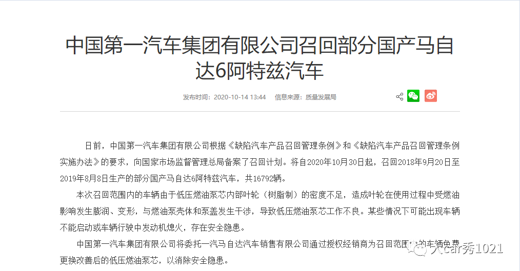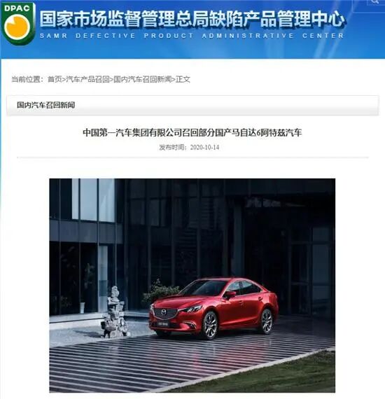 10月14日,马自达宣布将自2020年10月30日起,召回2018年9月20日至2019年8月8日生产的部分国产马自达6阿特兹汽车,共16792辆,而这次召回的原因源自“熄火门”。