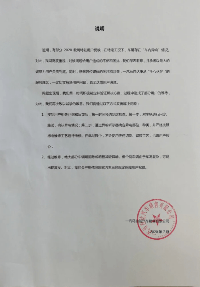 自“异响门”车主表示“现在害怕开车”后,7月份,一汽马自达发布了一份非常模糊的官方声明。