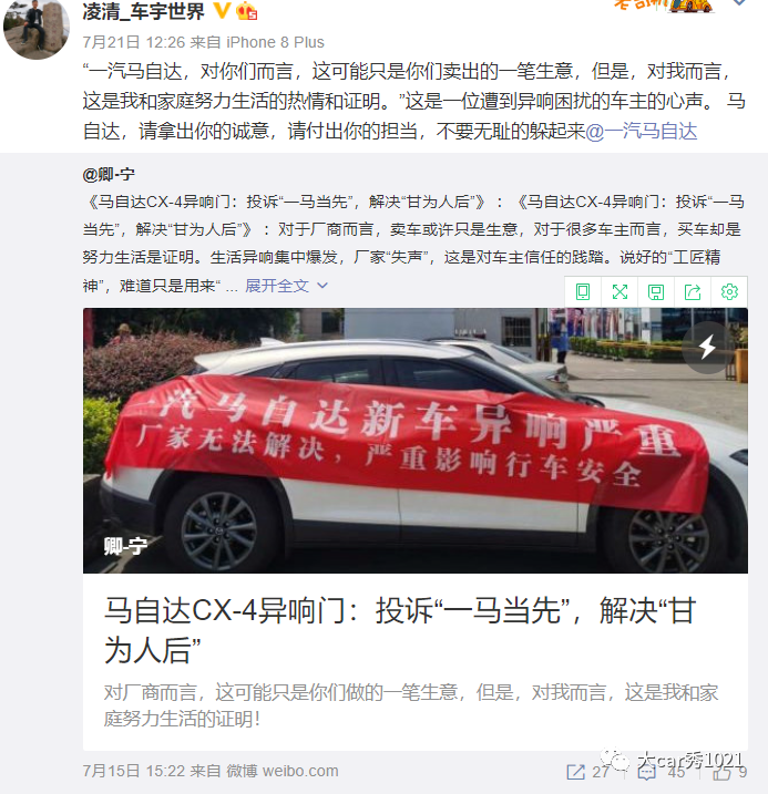 这是一位马自达CX-4(参数|询价)车主在微博上的发声。