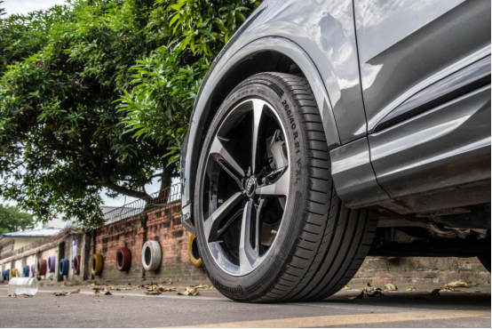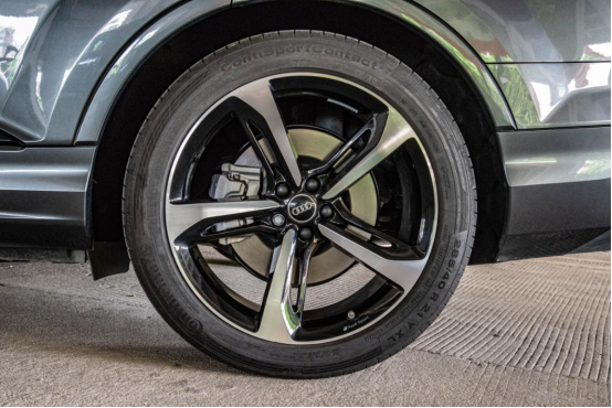 21英寸的双色五辐轮毂力量感十足,搭配的是运动型取向的马牌CSC轮胎。