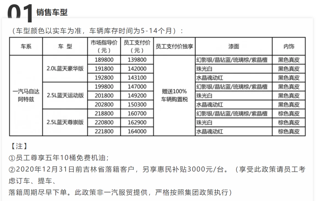 无独有偶,近日,一汽集团内部发布阿特兹车型的员工最新购车价格,全系车型指导价下调至13.98万-16.40万,同时还免购置税。根据一汽集团旗下公司“一汽服务贸易”近日发布的消息,一汽马自达阿特兹车型有一批车辆需要处理,并向集团员工出售。消息显示,这批阿特兹为库存车,同时也进行过批量整备修复,因此价格也降到了历史最低水平。从最新员工购车价来看,阿特兹全系车型基本以低于7折的方式出售。以市场指导价为18.98万元的2.0L蓝天豪华版为例,集团内部员工支付价为13.98万元,直降5万元;同时厂家赠送100%车辆购置税,这是内部员工独享优惠,而车辆购置税价值1.5万元。综合起来,这款车折扣达6.8折。而市场指导价为21.88万元的2.5L蓝天尊崇版,集团内部员工支付价为16.07万元,直降5.81万元,同样厂家赠送100%车辆购置税,而车辆购置税价值1.76万元。意味着,这款车型综合折扣达6.7折。目前马自达阿特兹车型的市场终端优惠在1.5万元左右,而厂家内部员工如此巨额的优惠力度,是相当吸引的,也是市场难以想象的。不过,这批阿特兹也存在一些“瑕疵”。此次参与购车优惠的阿特兹为国六标准,但车辆库存时间为5-14个月,在普通消费者购车习惯中,这已经属于库存车了。同时,该批车辆进行过批量整备修复,个别项目不享受质保服务,员工购买时需签订‘特殊车辆销售协议’。根据一汽服务贸易消息,该批车辆的销售对象为按集团规定具有员工购车资格的员工,优惠购车至12月20日止,同时“锁车籍1年”,也就是车辆在上牌后一年内不得进行交易更名过户。从库存时间来看,阿特兹车型的销售状况不太理想。一汽马自达旗下投产阿特兹、CX-4(参数|询价)两款车型,早前因爆发异响门事件而导致销量进一步走低。在10月份最新数据中,一汽马自达销量仅5076台,同比减少40.5%,其中CX-4当月销量为3125辆,而阿特兹销量为1951辆,环比上月下滑26.5%。日系四大品牌中,定位中级轿车的凯美瑞(参数|询价)、雅阁(参数|询价)和天籁都成为品牌主力支撑车型,月度销量最高能达到两万台以上。而作为小众品牌的马自达,旗下阿特兹车型的市场表现明显不足。此外,这批车辆经过“批量整备修复” ,购买需签订特殊车辆销售协议。意味着,这批车辆原本可能存在一些问题或缺陷,最终出现内部折价消化的情况。从国家市场监督管理总局网站上了解到,马自达6阿特兹汽车曾在今年10月被集体召回,原因是车辆低压燃油泵芯存在制造缺陷,从而导致车辆不能启动或行驶中发动机熄火的问题。厂家为此进行召回并更换改善后的低压燃油泵芯。不过,召回是汽车厂家比较普遍的措施,并不足以让车辆以大幅折价的方式出售处理。另外,我们还注意到阿特兹此前曾爆发异响门事件,遭大量车主持续投诉曝光,厂家曾表示将技术解决。今年以来,众多车主在网上投诉,阿特兹新车存在中控台异响、AB柱异响等问题,非常影响驾驶体验,因此也出现车主维权事件。由于涉及车身及车辆结构问题,众多车主反映多次返店处理后也未能有效解决异响。在月度投诉榜上,阿特兹的排名也一度高居不下。6月份,马自达中国品牌部相关负责人向媒体表示,“关于阿特兹相关问题,一汽马自达已经和车主联系进行情况了解和对接。技术团队也在进行问题调研。”7月,一汽马自达就“阿特兹异响问题”发布官方说明回应:称已制定并验证解决解决,严格按照标准维修工艺进行维修,在此过程不会使用任何切割、焊接工艺。同时,个别车辆由于车况复杂,可能出现复发,会按国家三包规定保障用户权益。即使这批车辆存在瑕疵,但降价力度较大,或许对于许多消费者来说都是足够吸引的,但是这批车辆仅仅对集团内部员工销售。而在市场终端方面,马自达的价格体系仍旧坚挺,马自达官方曾表示:马自达坚持价格销售,不会采取降价销售的措施,不打价格战。