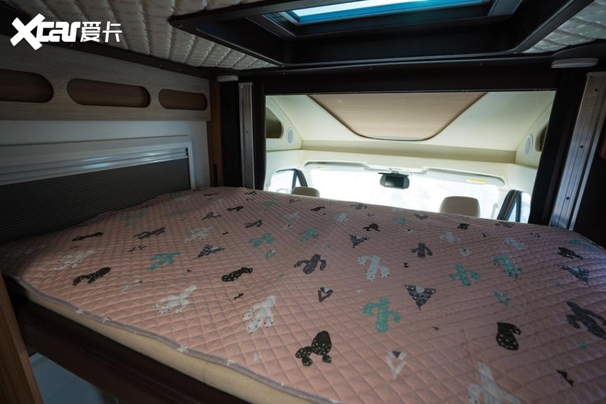 车尾床铺是一个非常大的亮点,采用后纵床+侧拓展舱的设计,经过拓展后,床铺的尺寸可以达到2050×1450(mm),满足两人睡眠需求绰绰有余。