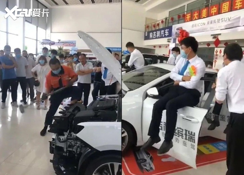 不过对于吉利这种低俗营销,早已是日常操作。假如你在节假日去过吉利的4S店,你基本都能看到“卖艺现场”:例如对着车头防撞梁一顿猛砸的壮士,还有那坐在车门上摇个不停的小兄弟,这些都是吉利认为能够突出自身质量的“妙招”,估计有网友会说:人家起码敢秀出来,不怕翻车啊。