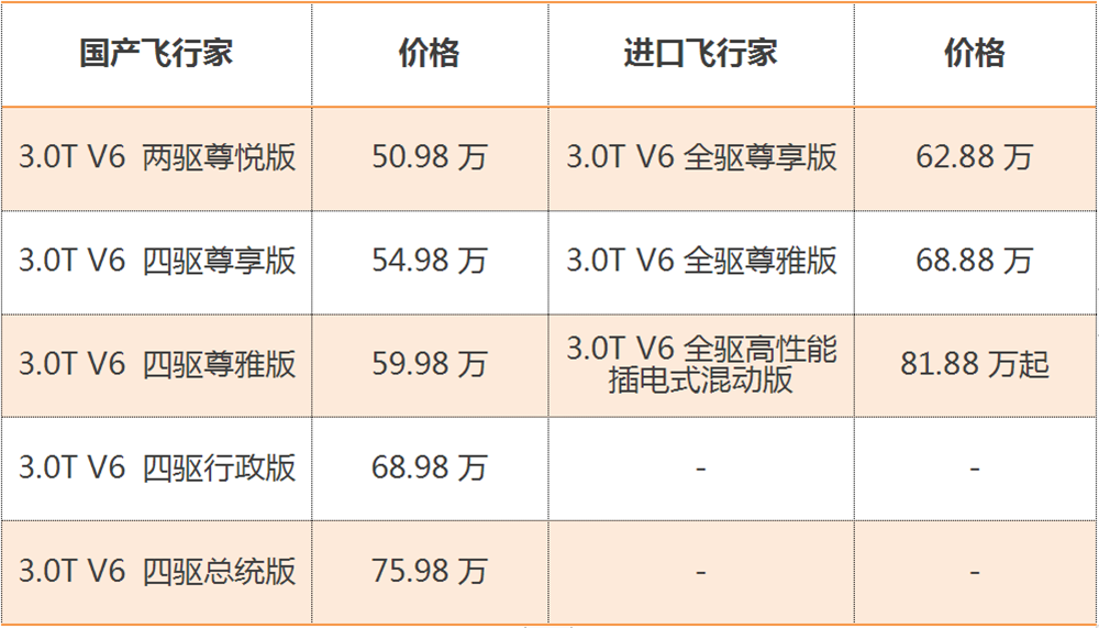 7月8日晚,林肯飞行家(参数|询价)正式上市并公布价格,全系共推出5款车型,售价50.98-75.98万元。对比进口车型的价格,国产林肯飞行家相对应的车型,售价至少都下探了8、9万,入门版本两驱尊悦版直接给出了50.98万的价格,相当有诚意,也在3.0T这个级别树立了一个标杆。国产与进口飞行家的价格对比:更重要的是,林肯飞行家全系搭载3.0升V6双涡轮增压发动机和10速手自一体变速箱。如果以排量论尊严,那毫无疑问它是一款非常香的大型豪华SUV,为什么?看看同级对手就明白了。对比同价位产品,飞行家真香?飞行家所处的50-80万的价格区间,并不缺乏有实力的竞争对手。譬如宝马X5(参数|询价)、奔驰GLE等。但从价格来看,宝马X5 3.0T四驱起步价75.99万,奔驰GLE 3.0T四驱起步价83.48万,奥迪Q7(参数|询价) 3.0T四驱起步价78.88万,大众途锐(参数|询价)3.0T四驱起步价70.98万。相比之下3.0T四驱最低配的飞行家,售价只有54.98万,这些竞品车型比飞行家至少都贵出了17、8万,最便宜的途锐也要贵15万,而这些车型的2.0T版本售价也都差不多在60万区间。所以在这个气缸数和排量定义豪华尊严的时代,入门只要50.98万的飞行家,似乎确实是“真香”的选择。从车身尺寸来看,飞行家的车身尺寸要比它的竞争对手们大一圈。国产版还提供2+2+2式六座布局和传统2+3+2式七座布局,其中,六座版第二排中央可选装更豪华的中央扶手,很好的照顾了第二排乘客的舒适性。由此可见,在国内消费者最关心的动力和空间方面,飞行家完全给予了他们尊贵的满足感——又大又有劲。也正是有了这一系列能“吊打”竞品的实力,昨晚的线上发布会中,厂家直接把飞行家定位成了“大型豪华SUV市场格局的破局者”,要知道去年这辆车的官方定位,还是大型豪华SUV市场格局的“重塑者”。这就相当于告诉那些竞品车型“不服现实就来碰一碰”。重塑是参与创造,破局是改变格局。显然飞行家国产,意在不留余力的进攻,打破大型豪华SUV市场上BBA的垄断。飞行家的胜算如何?从动力和车身尺寸来看,飞行家几乎是一款碾压的存在,但飞行家要明白的是,它所身处的这个价位或是说这个级别的车型,都不是善茬。譬如优惠后的揽胜运动版(参数|询价),终端价格也在70万这个区间。而BBA在这个市场的统治力就更大了,从销量来看,宝马X5今年1-5月份销量16216辆,奔驰GLE 1-5月份销量16469辆。飞行家想要成为破局者,或许还要多努努力。那么飞行家是否有实力来碰一碰呢?除了3.0T和大尺寸,其实飞行家最大的亮点还有豪华感的营造,以及极高的配置水准。豪华感营造方面,林肯飞行家延续了林肯的家族基因,坐进车内你会感受到一股纯正的“杰克丹尼”的味道。和国产冒险家(参数|询价)相同,飞行家也将进口版本10.1英寸的中空屏换成了12.8英寸,符合国内消费者的口味。这个价位的车,在车厢豪华氛围营造上没有弱的,但飞行家独有的美式豪华,可以说独树一帜。其他配置方面,新车标配ANC主动降噪系统、双层玻璃等多种隔音降噪技术为全新林肯飞行家营造出更为静谧的座舱体验。此外,全新林肯飞行家还配备了哈曼集团旗下顶级的Revel®UltimaTM 3D沉浸式音响系统,28个高品质扬声器增强车内成员的驾乘体验。智能车载互联方面,林肯飞行家搭载了全新SYNC+智行互联系统,支持自然语音识别,智能导航等功能,实测语音分辨能力确实比之前林肯大陆(参数|询价)上那套系统有了质的提升。但美中不足的是没有carpaly,缺少了一些功能性。舒适性方面,林肯飞行家配备了带30向电调的全体感尊享座椅,为前排乘客提供包含坐垫、椅背、腰托的全方位按摩与调节功能,并支持坐垫对左右大腿支撑的分别调节,贴合更多成员的身材。后排舒适性同样出色,除了拥有三排三种座椅布局,六座车型还配备了“机长座”,座垫加宽67mm、椅背加宽65mm,椅背角度可调10度。高配行政版和总统版车型还标配了第二排中控台和中央扶手。进一步满足了中国消费者多样化的需求,并以此带来更好的豪华体验。最后说说林肯飞行家在车身尺寸、配置、动力等方面在同价位车型中都有着明显的优势。至少在50万这个价格区间里,林肯飞行家凭借美系豪品质和综合的产品硬实力,已经可以对竞争对手呈现碾压的优势,成为真香车型。但能否打动目标消费者人群,成功在大型豪华SUV市场破局?我们拭目以待。版权声明:本文为线外邦独家原创稿件,未经授权请勿转载(部分图片来自网络,如有侵权请联系线外邦)