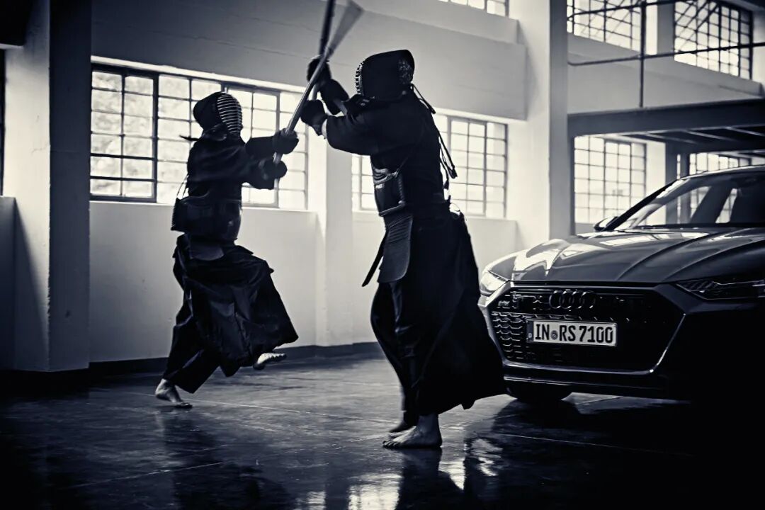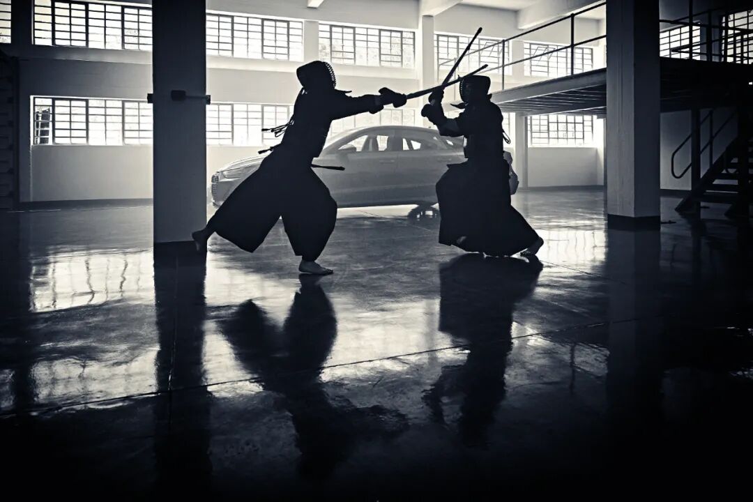 区别于西方更为常见的现代击剑运动,剑道对决的胜负不依赖于电子传感装置,而完全取决于裁判的判断。此外,选手会被赋予人剑合一(ki-kentai-ichi,気剣体一)的评分,以规避意外伤害的风险。剑道对决获胜的条件是,一方手持竹刀挥向对方头部并迅速收回。在进攻过程中,剑士必须大叫一声“men”—在剑道的术语中,这一动作被冠以“kiai”之名,即剑道的战斗之音。禅宗大师弟子丸(Deshimaru)曾将kiai定义为:“一声吼,一瞬间,时空和宇宙皆在其内。”