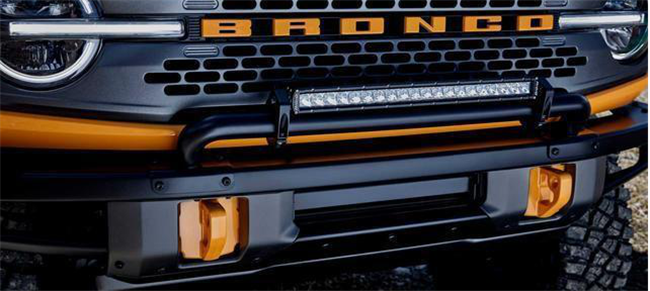 再看前脸,福特推出的Bronco两种外形设计与WEY坦克300都有笔直的前脸线条。WEY坦克300的前脸大灯造型与福特Bronco上的前灯也非常相似,只是WEY坦克300的大灯相比福特Bronco的大灯进行了180度翻转处理。前进气格栅,福特Bronco为横贯式设计,在黑色条幅上方点缀了字母Bronco;而WEY坦克300采用三条幅样式的镀铬饰条,中间为WEY的品牌LOGO。关于这一区域的设计,在大灯造型上的相似只能说是大家灵感相同罢了,单从大灯设计就认定是抄袭未免有些牵强。