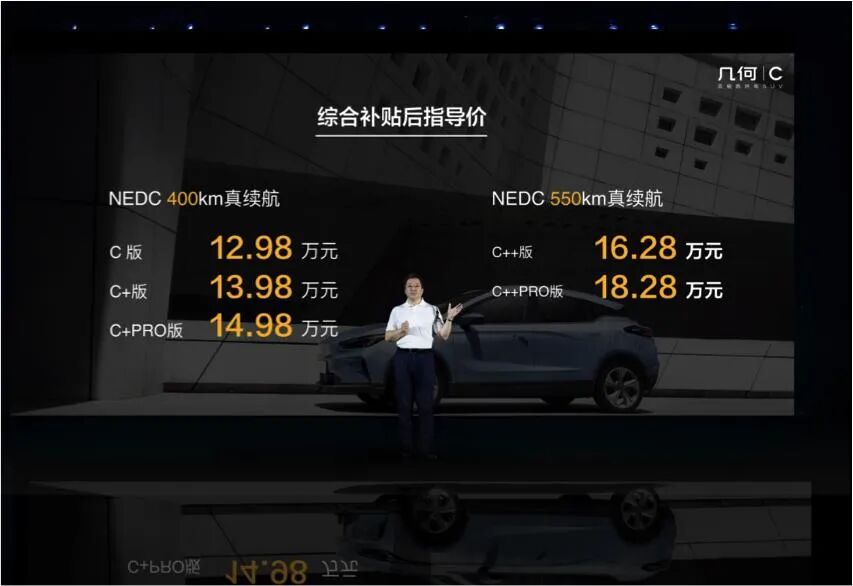 昨晚(8月7日)在杭州印象西湖边上市的几何汽车首款纯电动SUV几何C(参数|询价),也正式宣布C位出道。新车推出NEDC400km、NEDC550km两个续航版本共5款车型,综合补贴后售价为12.98-18.28万元。
