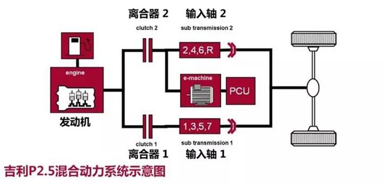 P2.5就是将电机、变速箱平行安装布置,电机放置于变速箱上,这样做的好处是不增加系统的轴向距离,使得结构更加紧凑,为乘员舱留出更多的空间。吉利采用的是将电机与双离合变速箱中的偶数轴进行耦合,所以不能像P2一样利用变速箱的所有挡位。