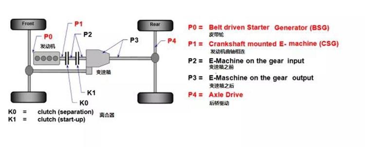 P0其实就是将原来的起动机更换为BSG电机,而BSG电机除了能实现起动机的作用,还可以在发动机熄火时为空调供电,起到节油的效果。但此种连接方式的电机并不能驱动车辆行驶。
