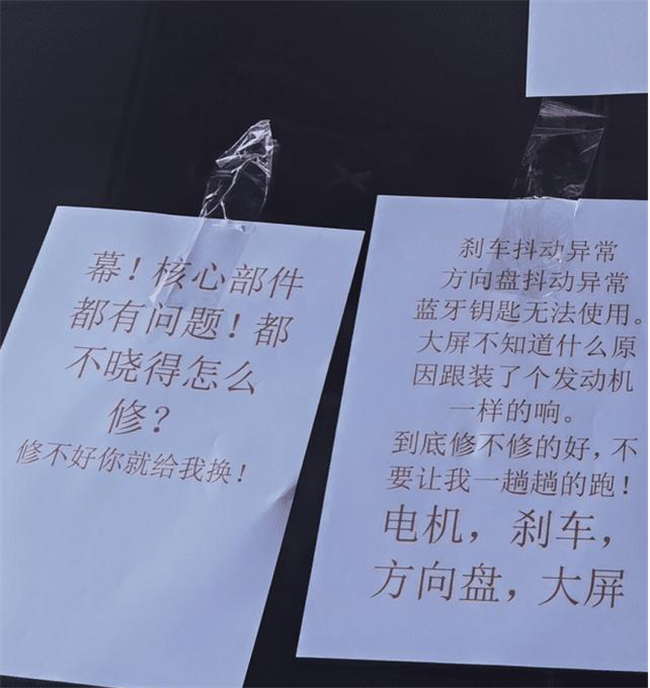 此外,网络上也流传出该事件的维权视频,视频内容显示,该车主拍摄了车辆中控异响、蓝牙钥匙无法使用等情况。视频中车主透露,基本上每个星期都会来服务中心“检修”,一次要花费90分钟,路途遥远。贴在车上的“问题贴”中提到“提了很多问题就不解决,无休止的跑服务中心修。”