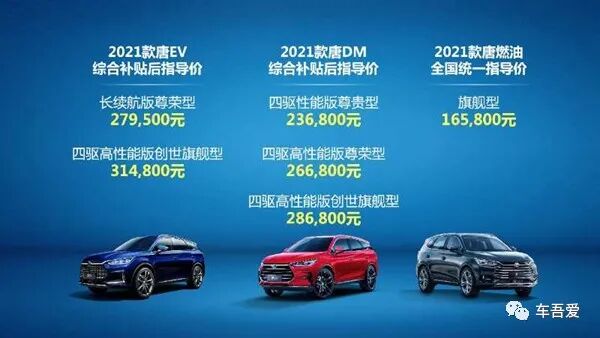 2020年8月16日,2021款比亚迪唐(参数|询价)正式上市。新车此次共推出燃油版、DM版以及EV版三种动力共计6款车型,指导价格区间为16.58-31.48万元。官方称,搭载刀片电池的2021款唐EV(参数|询价)将于第四季度开始交付。针对2020年9月30前购买2021款唐的车主,官方提供3年0息或5年贷款贴息、置换补贴最高20000元、唐燃油首任车主(非营运)享3年6次免费常规保养/唐新能源首任个人车主(非营运)享5年10次免费常规保养/唐新能源首任个人车主(非营运)三电终身质保、免费取送车、免费代用车、免费充电桩、终身免费OTA升级、终身免费在线导航、终身免费智能语音在线、2年免费车机流量等。详情见下表: