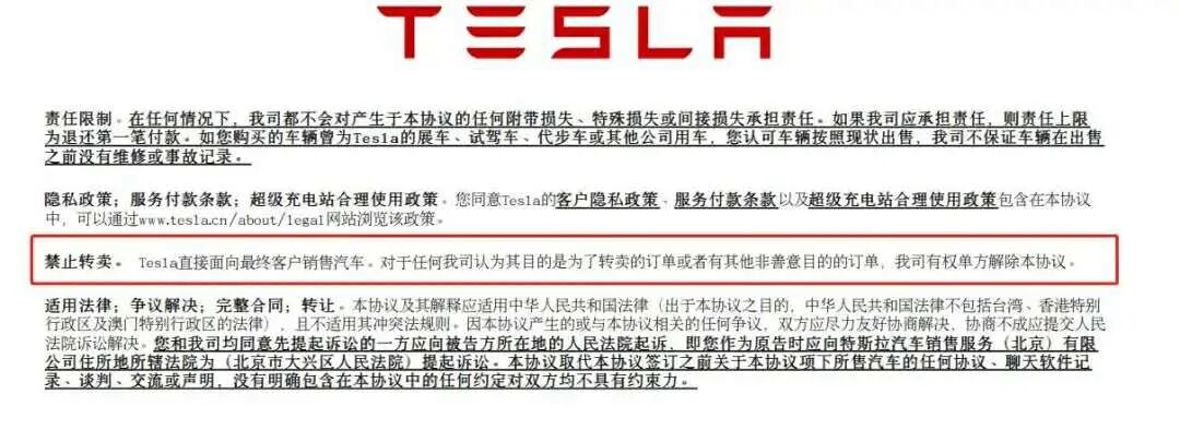 而且车子也是直接入户到车主的名下,并没有产生两个以上的买卖合同关系,根本不构成违反了特斯拉汽车订购条款中明确约定的禁止转卖条款,特斯拉拒绝交付显然是站不住脚的。