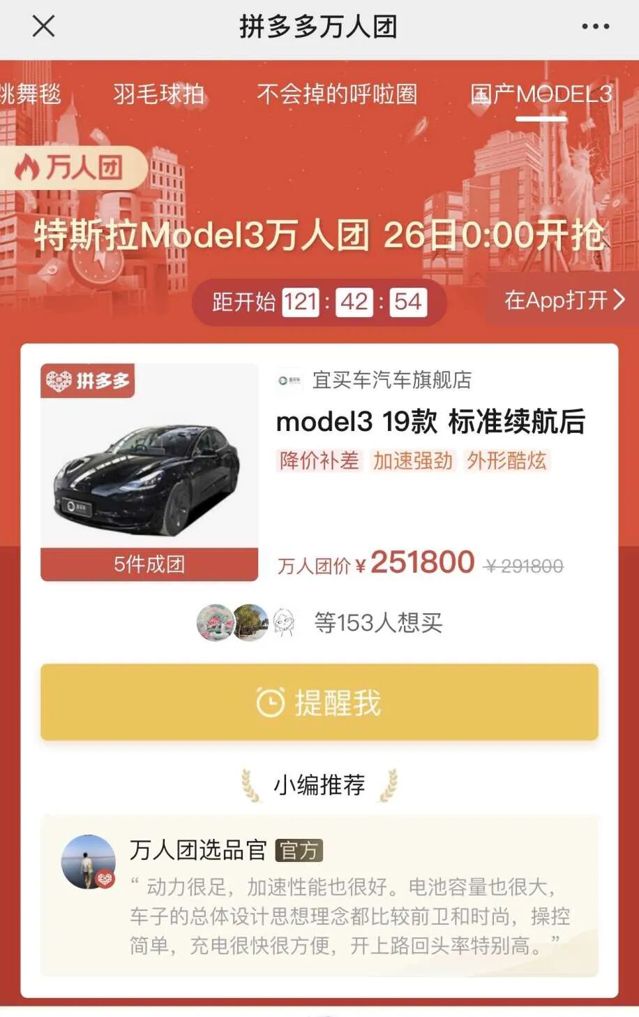 7月中下旬,拼多多上发起了特斯拉 Model 3(参数|询价) 团购活动,最终将会有5名幸运儿以25.18 万的价格买到一台标准续航升级版的 Model 3。这一价格比起特斯拉官方优惠后的售价还要便宜2万元,特斯拉随即辟谣,表示“未参与拼多多团购的相关活动。若出现任何关于团购的问题,特斯拉方面亦不承担任何责任。”