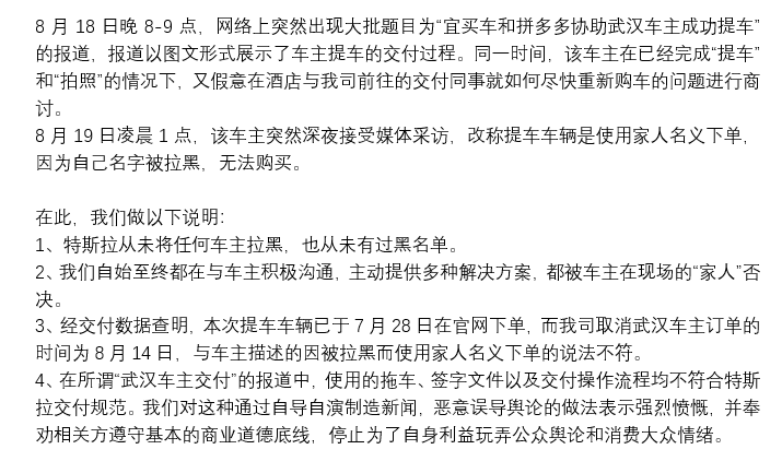 但尴尬的事情却随之发生,在车辆交付这一环节,一名来自上海的拼多多团购车主于8月16日表示,已经成功提车。而来自武汉的车主,因没有对下单信息有任何隐瞒,反而涉嫌违反特斯拉“禁止转卖”的相关条款,因此,特斯拉拒绝向车主交付车辆,并于8月14日关闭了这名车主的Model 3订单。