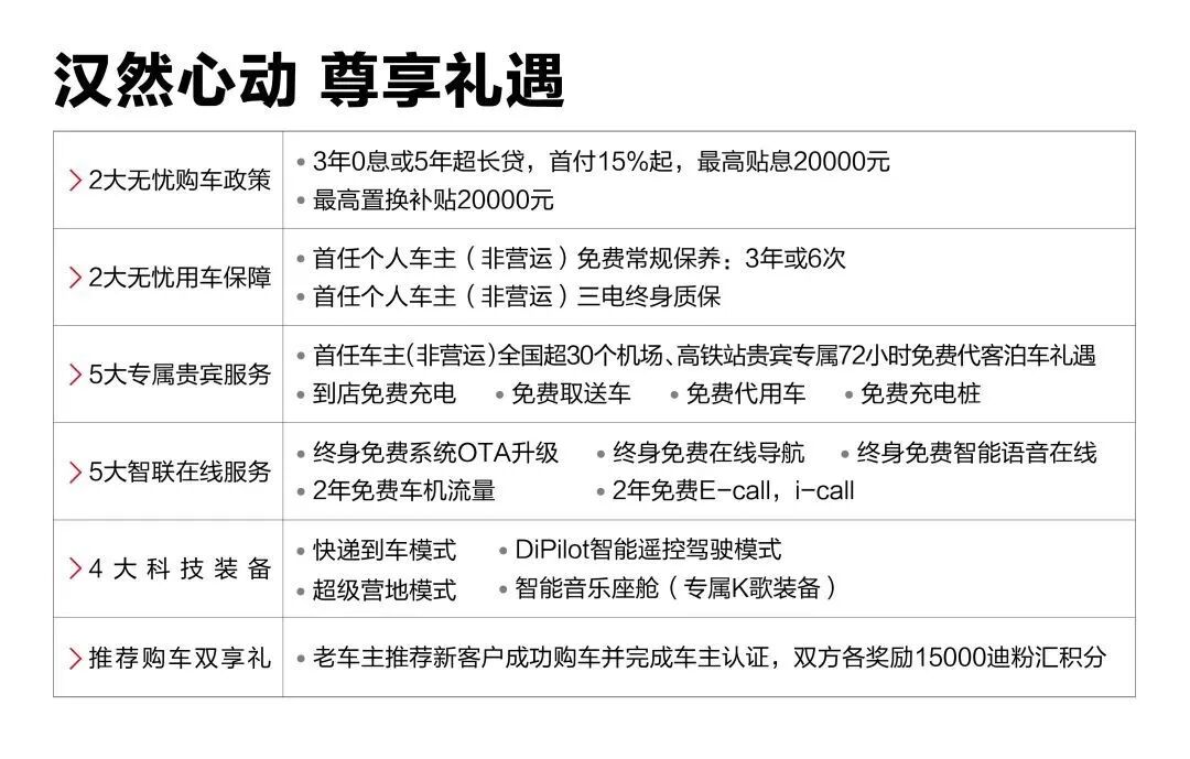 汉的颜值和实力,头号汽车早就在之前的《特斯拉请注意:有车名“汉”》一文中提及过,它的出现也早已不是新闻,汉EV半个月内就已经8000台订单量的战绩狠狠露了一把脸。 和坊间传言一样,官方放话也自信承认比亚迪把汉定位为B+级车型市场,竞争对手瞄准特斯拉Model 3(参数|询价)、奥迪A4、宝马 3系这些高档中型车。对标BBAT高档中型车,这就是中国品牌冲向高档车市场的重要信号。 其实,之前国产车也在这方面多次试水,只是水花略小,大家听了个响,就没了下文。SUV品类里长城的WEY品牌、红旗的HS7车型虽然都在“冲高端”,表现都没有汉亮眼。 十年磨一剑,经历了唐宋两代,再一次向“价格天花板”进军的比亚迪,决胜不只靠野心,还有与之配位的实力。 近年来,虽然中国品牌在设计、品质等领域取得了长足进步,但在核心技术和整车性能上只能跟跑,没法领跑。 特别是在冲击中型和中大型轿车市场的战役中,中国品牌在高端轿车品类仍未改变核心技术和整车性能受国际高档品牌压制的客观局面。 先天的价格配置优势竟变得孤掌难鸣,甚至成为牵制品牌和产品形象向上的负面因素,被打上了“便宜没好货”的标签,受到双标对待。 终于“汉”来了,就像大汉王朝大一统一般,在这片沃土上大刀阔斧、披荆斩棘,自此之后,一切都是新的,就像刀片电池的横空出世一样,要玩就玩别人没有的! 全球首款搭载刀片电池的轿车,汉EV重新定义了新能源汽车安全标准。汉DM搭载的动力电池采用“七维四层”高温稳定安全矩阵,具备全球最安全的电池安全保护系统。 采用先进激光钎焊工艺,全车43处使用热成型钢,不仅如此,汉的1500HS热成型钢使用量(100公斤),创中国量产车之最。 入门即豪华,Dragon Face设计语言的凌厉前脸、蛟龙入海流线侧身、贯穿式龙爪尾灯等设计,而大面积进气格栅的汉DM则塑造出一股跃然天际的“游龙”之姿,烘托出中大型轿车的豪华气质。 内饰方面,其采用环抱式品格设计语言,提供多种配色搭配方案,整体颇有质感,突出了中式美学的概念。 配置方面,比亚迪汉科技十足,其配备了15.6英寸触控式中控屏及DiLink 3.0智能网联系统,多功能方向盘、全液晶仪表盘、全景天窗、前排座椅电动调节、驾驶位座椅通风/加热等功能。 动力方面,汉EV提供两驱版和四驱版两种车型,两驱版最大功率163千瓦,峰值扭矩330牛米;四驱版搭载高性能高集成碳化硅MOSFET电机控制模块,总功率为363千瓦,峰值扭矩680牛米,零百公里加速仅需3.9秒。 当然,这些看似很唬人的数据都是要建立在能够得到消费者的青睐之上的,不然这些数据都是毫无用处的一纸空文。所以接下来,我就想给大家说说我眼里的这台“汉”有什么值得期待的! 除了刀片电池外,华为技术的应用也是汉系列最大的亮点和卖点。汉搭载华为HiCar 做5G技术的先行者,不管有电没电,有网没网,都能用手机打开车门,实现手机和汽车的分布式无感连接、手机和汽车资源虚拟化共享、应用和服务在多设备共享。让用户体验车内、车外无缝流转。 在21世纪,创21项之最。树立了新能源汽车的安全、性能、豪华标杆。汉有多强,那Model 3和小鹏P7(参数|询价)和其他高档中型车就有多慌。 从车内空间的表现来看,汉确实对得起中大型轿车的定位,跟竞品拉开了不小的差距。摆脱了电池包的限制,比亚迪在空间设计上可以更少受纯电车型设计手法的限制。 车长近5米,大气和豪华的内部空间,完全达到了奥迪A6L(参数|询价)这样中大型轿车的水准,搭配抢眼的高端配饰,将商务和随性完美地结合在了一起。 而在性能上,比亚迪汉也采用了不同的策略。汉EV跟小鹏P7一样,也有两驱版和四驱版,但不同的是,汉EV的两驱版是前驱,而小鹏P7是后驱。 两驱版小鹏P7的电机功率更大,所以零百加速后驱小鹏P7是要优于前驱汉EV的。但四驱版车型汉EV的性能又是比小鹏P7强悍的,它的百公里加速直接减到了3.9秒。 Model3有点老生常谈了,一波又一波的割韭菜纷争,虽然这款车除了做工差点,基本上没什么其他大问题,但无疑性价比太低。 Model 3也并非跟汉和小鹏一个级别,因为尺寸差距实在有些悬殊,但因为价格相近,所以成了竞争对手。 比亚迪表示汉的动力表现完全可以对标特斯拉Model S(参数|询价),如果不是汉的实际销售定位,或许打法上还能有能精彩的表现。 从定位和售价来看,汉无疑走的是高端路线,核心的如电机功率和续航能力也完全符合高端纯电车的标准,因此这个级别的竞争对手主要是小鹏P7和特斯拉Model 3。 在绝对的续航能力上小鹏P7最强,品牌溢价能力上特斯拉最强,汉的绝对性能最强,三者各有优势,但汉本就没有定位成一款走量车型,更多的是以旗舰的身份塑造起品牌的高端形象。 汉EV超长续航版的NEDC综合工况纯电续驶里程可达605公里,这个数据已完全足够日常使用。比亚迪要做的就是把高端形象树立起来,顺道把实用性兼顾上,让消费者更容易买单,一举两得! 再看看汉DM, 作为国内加速最快的插电混动轿车,搭载DM-p技术,采用2.0T发动机,匹配三合一电驱总成,综合输出功率可达321千瓦,峰值扭矩达650牛米,0-100km/h 加速时间仅为4.7秒。 同时新车纯电续航里程为81公里,馈电油耗仅为5.9L/100km,并提供纯电、并联、串联、高速、能量回收五种动力模式选择。 所以,无论是汉EV还是汉DM,消费者都会有机会选到自己真正喜欢的那一款,而且比亚迪还为汉客户推出