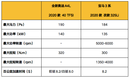 我们以两款车型主销的动力版本进行对比,可以看到搭载2.0 TFSI + 7速S tronic智能变速箱动力组合的全新奥迪A4L,在账面参数上要略胜宝马3系一筹。而在实际加速表现上,搭载quattro ultra智能四驱系统的全新奥迪A4L,百公里加速时间要比宝马3系快上那么0.2秒。如果你选择45TFSI车型,那么0-100km/h的加速时间能够缩短为6.6秒。