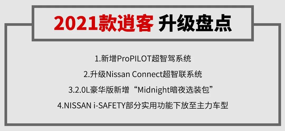 智能化是此次2021款逍客的重点升级方向,新车增加了ProPILOT超智驾系统,为逍客提供了更丰富的智能辅助驾驶功能,而NISSAN i-SAFETY的部分实用功能也在此次改款后下放至主力车型。在车机系统方面,2021款逍客升级了Nissan Connect超智联系统,为用户提供更加智能化的娱乐与便利功能。在外观设计部分,新车新增了 “Midnight暗夜选装包”的外观套件,为消费者提供了更加个性化的外观选择。