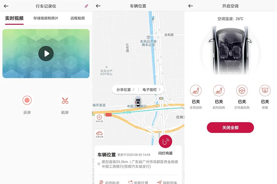 其中的远程控制功能让消费者可通过日产智联手机APP实现对车辆的远程控制,如控制门锁、空调、座椅加热、查看车辆位置、查询车辆状态、远程启动发动机、启动行车记录仪、设置导航等。