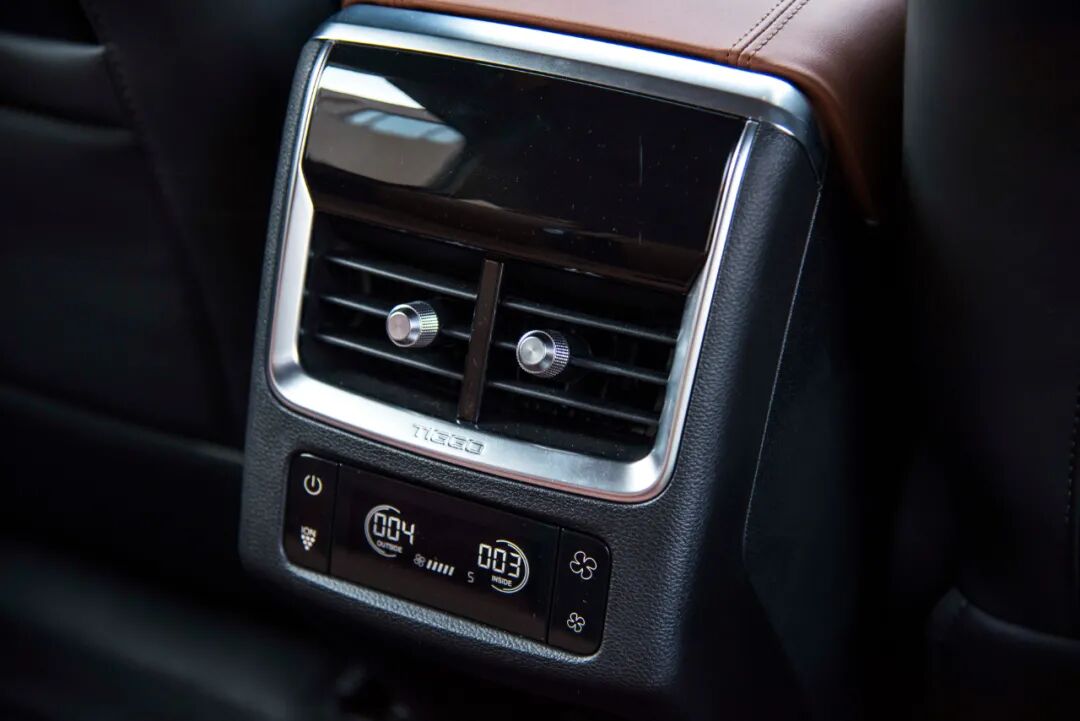 第三排座椅是大家最关心的,所以这一条我们单独来讲。头部空间很充裕,这点无须担心,而从腿部空间来说,在将第二排座椅的位置调整至最靠前后,身高180cm、体重70kg的体验者的膝盖此时依旧是紧贴着第二排座椅的靠背的;整个座椅的臀点位置较低,但大腿处支撑则被刻意抬高了,加之座椅填充本身较为丰满,这能在一定程度上缓解长途乘坐时腿部的疲惫感。除此之外,第三排座椅处还设置了一个可以手动调节风量的空调旋钮,并且左右各设置了一个空调出风口,这一配置目前在同级别车型中是非常罕见的。