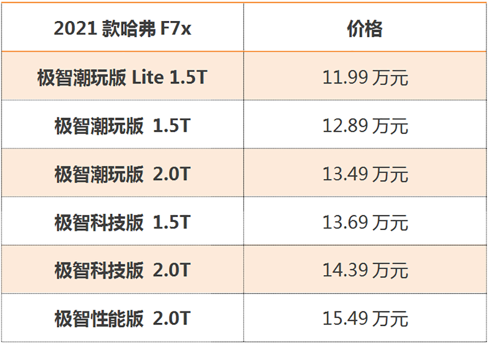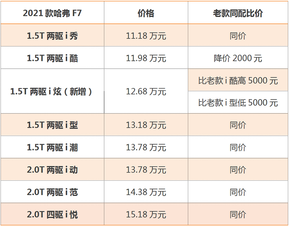 作为新老更替的改款车型,2021款哈弗F7/F7x早在今年的成都车展就已经亮相。9月16日,这两款车在哈弗F系两周年庆典上正式发布。本次发布会哈弗F7上市了8款车型,售价11.18万元到15.18万元。其中1.5T版本5款,2.0T版本3款。哈弗F7x(参数|询价)上市了6款车型,售价11.99万元到15.49万元。其中1.5T版本3款,2.0T版本3款。哈弗F7/F7x均有一款高配2.0T四驱车型可供消选择。两款车在价格区间上与老款保持了一致,并且对在9月30日前下订的朋友们提供了七重大礼。包括购车现金优惠、金融贴息、置换补贴、增购补贴、专属套餐礼包、保养无忧礼、互联流量礼。设计升级,更年轻当时间来到2020年,最早的一批90后已经陆续步入了30岁的大门。主流消费人群的转变对于每一个消费品市场都产生着潜移默化的影响,体量庞大的车市自然也不例外。此次哈弗F7/F7x的改款在设计上注入了更多年轻元素。在延续老款设计风格的同时,新车的前进气格珊由圆孔形改为了网状,内饰上全系标配了尺寸更大的12.3英寸触控屏,在中控台的细节上增添了一些元素,豪华感进一步增强。总体上两款车依旧是偏运动风格,强调年轻范。尤其是轿跑车型的哈弗F7x,在这个价位里颜值颇为能打。车机升级,更智能哈弗F7/F7x此次改款在配置上做了很大提升,侧重点主要在智能化方面。其率先搭载Fun-Life 2.0系统,首搭腾讯TAI3.0功能,在配置上最直观的体现就是全系标配了原生车载微信,在一些车型中新增了声纹面部识别功能、高清360全景影像等。腾讯TAI3.0功能并不是第一次出现在我们视线里,几个月前哈弗曾经专门为其新一代智能网联系统开了个发布会,会中就曾提到,腾讯TAI3.0功能将集成于哈弗新一代智能网联系统中。目前来讲,在技术上腾讯TAI3.0是车联网中较为先进的。对于消费者来说,各家车企的车机系统五花八门,一时难以分辨好坏。只需记住一点,与互联网大厂合作的系统相对来讲对于各种软件的适配度会更高,甚至一些功能是互联网厂商为车载功能量身打造的。车机系统的优劣不在于功能多少,而在于使用的流畅程度。这一点最好亲自去店里试一试,做个比较。新老对比,哪个更有性价比那么除了车机系统的升级,各款车在配置上还有哪些变化呢?我们先看看哈弗F7的新老对比情况。哈弗F7除次低配i酷版价格比老款降低了2000元外,其余各款均与前款保持同价。此外在i酷版与i型版之间新增了一个配置——i炫版,售价在老款i酷版与i型版之间,各差5000元。哈弗F7顶配的四驱版本没有减掉任何配置,相反增加了大量实用性功能。根据官方的选装包价格看,新增配置中的主驾驶座记忆、声纹面部识别、外后视镜记忆同时选装要2000元,车载空气净化器500元,多色氛围灯1000元,仅这几样配置新款四驱版本就相当于优惠了3500元,性价比非常高。1.5T两驱i潮版和2.0T两驱i范版作为两个排量中两驱版本的顶配车型,在新增配置上一致,相比老款都少了自动泊车功能,该配置选装价格为1000元。这两款车新增的配置丰富度实用度都很高,如全速自适应巡航、车内PM2.5过滤装置、内置行车记录仪等等。其余各款车的安全带未系提醒功能均由全车减为了前排,相应的增加了大量配置,总得来说性价比都有所提高,但如果说最具性价比的,笔者认为还是四驱版本及两驱,两种排量各自的顶配车型。如果预算有限的话,最低配在增加大量配置同时仅减少了胎压显示、无钥匙启动和后排安全带未系提醒,11.18万的价格下这样的配置也算丰富,对其他配置需求不多的化这款车就足够了。其他中配车型在配置上形成了梯次,对于不同程度的用户需求都可以满足,这就看消费者自己有没有特别想要的功能,据此选择上到哪一级别配置。再来说说哈弗F7x。这款车的配置我们可以大致归个类,1.5T与2.0T都有潮玩版和科技版两种配置,此外1.5T最低配是极智潮玩版LITE(参数|询价) ,2.0T最高配是极智性能版,各款售价均与老款一致。在配置上同样的全系将中控屏升级为12.3英寸,部分车型搭载了最新的Fun-Life 2.0系统,此外新老款配置的变化F7x并不如F7那么大。当然,并不是说新增配置少就不好,如果老款车本身配置已经足够丰富,那新款自然也没有太多增配空间。最低配相比老款变化不多,远近光灯升级为LED,扬声器由6喇叭升级为8喇叭,座椅由织物改为仿皮,增加了GPS导航,但车联网及OTA升级功能缺失。总得来说新款性价比小有提升。1.5T和2.0T的极智潮玩版配置升级最多,两款车相比老款都增加了前后排头部空气气囊、车道偏离预警系统、车道保持辅助系统、道路交通标识识别、主动刹车这些安全配置,安全性大大提高。此外还新增了自适应巡航、雨量感应式雨刷和车内PM2.5过滤装置,让这两款低价位的车型获得了不错的性价比。1.5T和2.0T的极智科技版配置变化很小,新增了内置行车记录仪和多色氛围灯,但少了自动泊车入位,性价比只有小幅度提升。顶配车型2.0T性能版增加了内置行车记录仪、驾驶位座椅记忆、面部识别、多色车内氛围灯和车载空气净化器。由于本身老款配置已经做到了足够丰富,新款能加的东西并不多。很难讲哈弗F7x哪款性价比最高,相对来说笔者认为考虑1.5T排量的话,次低配极智潮玩版 1.5T比Lite版划算很多,钱不宽裕的话上个次低配,油耗低,安全性高,配置也不寒酸。13万到14万的价格,极智潮玩版 2.0T比极智科技版 1.5T低2000块钱,要高配置低油耗就选1
