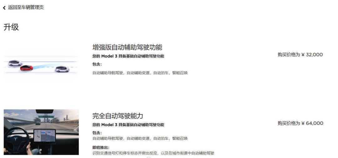 9 月 22 日,特斯拉针对已经交付成功的车主们推出了「增强版自动辅助驾驶功能 EAP」限时付费升级包,截止时间为 9 月 30 日,基础版 Autopilot 仍为标配,此升级包囊括了四大已上线功能:自动辅助导航驾驶「NoA」、自动辅助变道、自动泊车、智能召唤,选装价格 3.2 万。