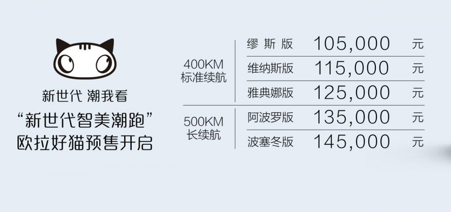 9月27日,万众期待的欧拉好猫正式开启预订,预售价为10.5万-14.5万元,为答谢首批领养好猫的“喵星人”,欧拉特意定制了专属领养权益:在9月27日-10月31日期间,线下支付2000元定金,提车即享价值20000元豪华大礼包,包含2年免费充电、至高5000元换购补贴、至高4500元贴息、价值4500元的原厂智能充电桩等专属好礼。考虑到预售火爆,欧拉承诺追加到1314“只”好猫限量供应,用户只需在长城欧拉天猫旗舰店支付1520元定金,即可在上述20000元大礼包的基础上,叠加享优先提车权、优先礼包等甜蜜权益。 颜值逆天“喵星车” 重塑经典美学,欧拉好猫极具辨识度的高颜值,让人过目不忘,绝不随波逐流。既有复古主义的仪式感,又有未来主义的科技感,高贵、优雅、神秘,满足车主人的张扬个性与独特品味。 欧拉好猫的外观采用复古未来主义设计风格,灵感来自于60年代人们对于太空的构想,由前保时捷设计师艾蒙·德尔塔亲自操刀,从年代感过渡到未来感。 车身线条传承了充满复古色彩的早期汽车语言,同时兼顾了前沿科技之美。猫眼复古全LED大灯、流水动态LED高线尾灯,超大全景天幕、18寸双子量双面个性轮毂,基于用户的多元化需求,再次定义潮流新风向。 欧拉好猫的内饰设计同样将复古未来主义贯彻到底,时尚悬浮式一体式连体大屏,大量缝线及菱形皮纹,辅以镀铬金属装饰,加持3D-Mesh包覆工艺,奢华感油然而生。 麂皮材质坐垫与两侧的硬朗皮革刚柔并济,精研人体工学定制扶手箱,将驾驶感受提升到新高度。 横向贯穿式出风口,搭配中控台下方的“钢琴式”按键,俨然是年轻人心水的复古猫王收音机。 柠檬+咖啡,猫力十足 新时代的电动车,离不开强大的平台支撑,欧拉好猫是基于长城汽车柠檬平台架构+咖啡智能生态打造的首款纯电车型,硬核“猫力”让同级车汗颜。 柠檬是长城的三大技术品牌之一,全新纯电平台架构采用三合一集成化电驱动和智能模块化设计,赋能欧拉好猫的三电系统更小体积、更轻重量、更高效率和更大延展性,NEDC工况续航里程长达501km。同时还可以实现30分钟内把电量从30%提升到80%,快充12分钟续航就能达到100km,是时候与里程焦虑说再见了。 在猫力御守下,欧拉好猫基于CNCAP五星及中保研GOOD级别设计标准,360°的全方位守护,为每一次出行带来最可靠的安全呵护。 如果说柠檬平台架构赋予了欧拉好猫强健的筋骨,那么咖啡智能生态则让欧拉好猫绝顶聪明伶俐。 欧拉好猫搭载的ORA Pilot 3.0具备多达14项以上驾驶辅助系统,可实现L2+级自动驾驶,配备有ACC自适应巡航系统,ICA智能巡航辅助、HMA智能远光灯辅助等多项智能配置。未来通过FOTA升级,能够支持L3以上级别的自动驾驶技术。 对很多女性来说,停车入库是件很头疼的事,欧拉好猫的360高清全景影像系统,后方配有12颗雷达探头,6颗摄像头,实时监控后方情况,倒车一目了然,而带记忆与自我学习功能的泊车辅助系统,可实现自主式泊车,从此告别尴尬。 FCW前碰撞预警、AEB自动紧急制动系统、RCW后碰撞预警、LDW车道偏离预警等多达8项警报+14项以上的驾驶辅助系统,在多种路况环境下为用户保驾护航,安心驾驶。 欧拉好猫已经超越了一款车作为交通工具的属性,而变成了一种温暖贴心又安全的陪伴。虚拟管家猫侍者配合ORA smart-café™主人模式,让你“宠猫”有道。 好猫当配潮人 有出行需求调查报告显示,颜值和配置已经成为影响90后年轻群体购车决策的重要因素。 欧拉品牌在很多年轻人心中已经树立了生动有趣、更懂年轻人的品牌形象,同时,伴随女性消费意识的觉醒,悦己原则已经破圈到汽车品类,但是市场上能满足女性审美和驾控需求的智能电动车却少之又少。 因此,欧拉好猫的出现恰逢其时,独特的魅力、个性的表达、过硬的实力,精确把握住了年轻人的喜好,更俘获了众多年轻女性的芳心,这在当下的汽车行业非常罕见,可以说,好猫精准定位,与乐于尝鲜、走在时尚潮流前沿的年轻一代用户高度匹配。 为了让广大用户感受到来自欧拉的深情告白,欧拉原本计划优先将前520台好猫专供女性,但是预售情况相当火爆,这“520只好猫”遭疯抢!欧拉豪气宠粉又将领养计划追加至1314台,且不限男女。先到先得的喵星人将成为好猫的首批车主,完美诠释猫式性感与优雅。 结语 复古未来主义来源于不断变换的“未来”,也是艺术与科技的延伸,时尚潮流的新世代,就要有欧拉好猫这样的新世代智美潮跑相伴!心动不如行动,快快来“领养”你的好猫!