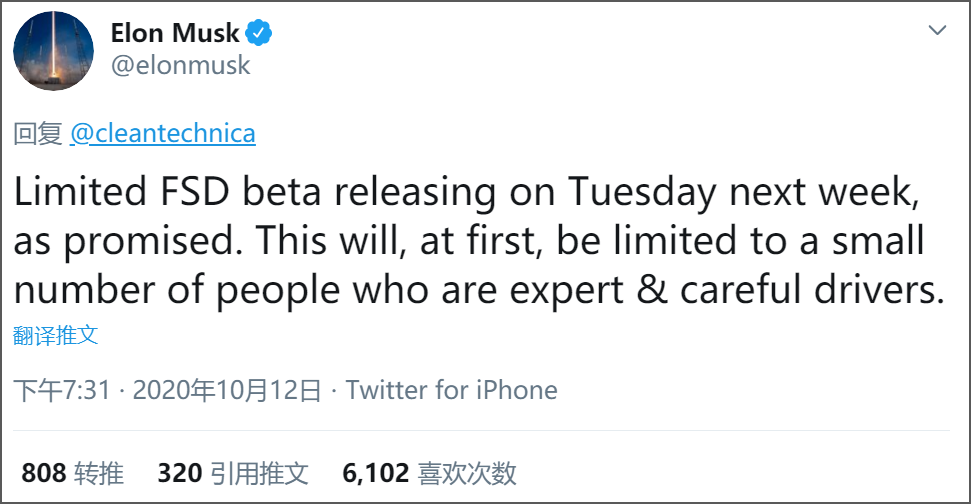 “完全自动驾驶测试版将于今晚推出,它将非常缓慢且谨慎,因为它应该如此。上个月,在特斯拉电池日上,马斯克就预告说,下个月将推出完全自动驾驶;9天前,他又发推:“按照承诺,下周二将发布有限的完全自动驾驶beta测试版。首先,这将只限于少数细心和专业驾驶的司机。”