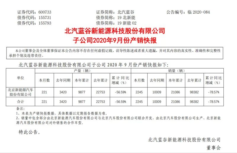 2018年,中国国内汽车市场首次遭遇“寒冬”期,多数车企为了实现销量目标也在不断的改变战略和调整计划。然而到了2020年,疫情的爆发又让多数车企“沦陷”,但是对于大部分车企来说,它们依然试图改变暴跌现状,在市场上也不断的推出新品,让更有产品力的车型参与市场竞争,以求改变“萎靡”的市场态势。随着国内疫情的有效控制,以及大部分汽车企业的积极努力,可以说新能源汽车在今年第三季度已经开始回暖,金九银十最佳销售旺季,许多新能源汽车企业也开始发力,并且在9月份取得了非常不错的销售成绩。数据显示,今年9月份,国内的新能源汽车产销分别达到13.6万辆和13.8万辆,环比增长28.9%和26.2%,同比增长48.0%和67.7%。1-9月,新能源汽车产销73.8万辆和73.4万辆,同比分别下降18.7%和17.7%,降幅比1-8月收窄7.5个百分点和8.7个百分点。由此我们可以看出,国内目前的新能源市场已经开始回归正轨,并朝着更大的市场份额去发展,但是有一个车企却仍然没有色,这就是北汽新能源。反差太大 北汽新能源暴跌8成日前,北汽蓝谷发布子公司北京新能源汽车股份有限公司最新销量数据,9月,北汽新能源销量为2245辆,同比下降77.57%,去年同期销量为10009辆。1-9月累计销量为21086辆,同比下降78.57%,去年同期累计为98382辆。