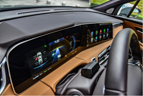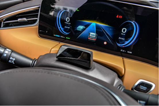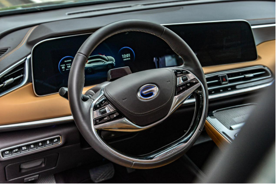 来到车内,Aion LX的内饰设计最大的亮点在于弯折屏幕以及出色的用料。方向盘前方近168°的弯折全贴合12.3寸双屏相当惊艳,显示信息也全面。用料方面可以看出广汽传祺下了重本,麂皮材质覆盖的顶棚,Nappa材质的真皮座椅,多种材质拼接覆盖的中控面板等等,无一不在体现豪华感。
