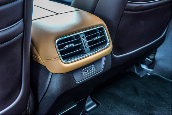 前排扶手箱后方配备有空调出风口、两个USB插孔以及储物格。由于电池布局规整,因此后排地板完全平整,没有任何凸起,所以在后排同时乘坐三人的情况下也不会影响到中间乘客。