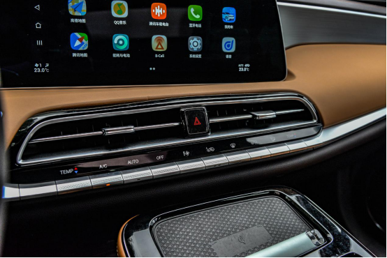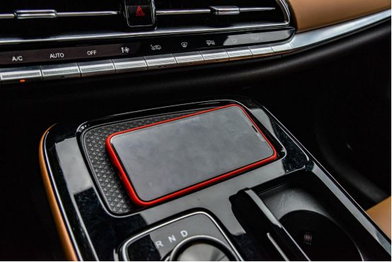 与Aion S触摸式的空调控制面板不同,Aion LX空调控制采用的是实体按键,驾驶时可实现盲操作。下方配备有手机储物板,并支持手机无线充电功能,非常便利。升降式的旋钮换挡杆设计非常有仪式感。