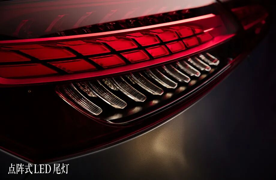 承袭S级轿跑车的LED尾灯设计,LED光源呈点阵状排列,映射出如龙鳞凤尾般的大气磅礴;横向排列的反光板如同凤凰羽毛,漫反射的柔和光源璀璨辉然,让气势优雅展现。