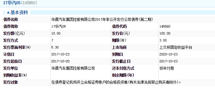 很多人应该对股票有一定的认知,估计有些车友就是股民,至于债券,毕竟它的收益比不了股票,是一种相对低调、稳健的投资品种。日前,有媒体报道称,华晨集团规模为10亿元的私募债“17华汽05”于10月23日到期,且未能按期兑付。