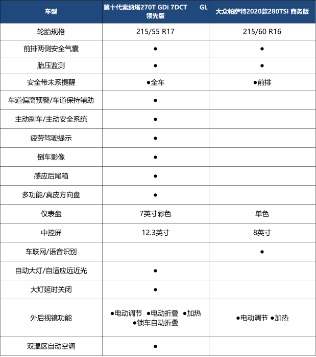 大众帕萨特其实除了自身的商务属性以及品牌力的加持外,最重要的因素是因为其拥有越级的配置。大众帕萨特的的官方指导价格区间为18.59--28.29万元,而第十代索纳塔的官方指导价格区间为16.18-20.58万元。通过对比不难发现,无论是低配车型还是顶配车型,第十代索纳塔在价格更低的情况下却在配置方面更加丰富。