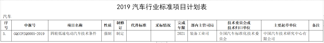 早在2019年3月21日,工信部科技司就曾对申请立项的《四轮低速电动汽车技术条件》等9项强制性国家标准计划项目予以公示。其中低速电动车的国标从推荐性变为强制性,重新开始制定,并开始向社会征求意见,完成期限为2021年。