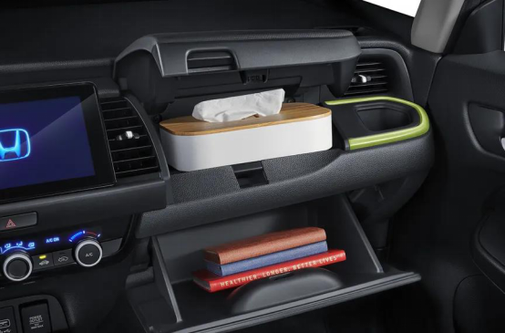 全新一代飞度在空调的精致度方面下了功夫。不仅将内外循环的切换模式,从具有90年代味道的推杆式换成了按键式,同时空调模式的显示区域也从原来的贴画变成了屏幕,大大提升了中控区域的精致感。同时,必须赞一下副驾前方的储物箱上下双开的分层设计,各种零碎、证件、纸笔有了归属,再也不用和大件物品挤在一起。本田在细节上的用心可见一斑。