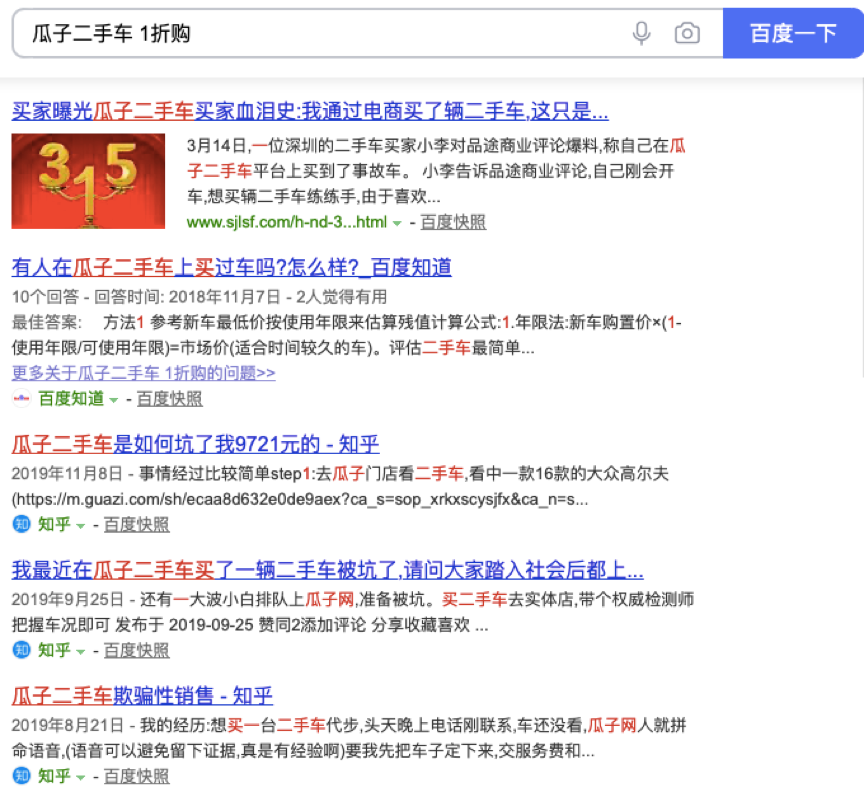 在网络上搜索“瓜子二手车 1折购”,搜到的内容都是“买家曝光瓜子二手车血泪史”“瓜子二手车是如何坑我9721元的”“瓜子二手车欺骗性销售”等相关的内容,可见消费者苦瓜子二手车久矣。