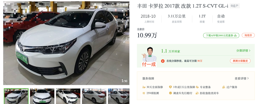 以瓜子二手车官网上一辆丰田卡罗拉(参数|询价)2017款 改款1.2T-CVT车型为例,上牌时间为2018年10月份,表显里程3.11万公里。官网显示这台二手车卡罗拉标注价格为10.99万元,首付金额只需要1.1万元,分期3年共计36期还完,月供为4047元,计算下来金融全价达到了15万元,贷款成本就已经接近了这台卡罗总价10.9万元的五成。