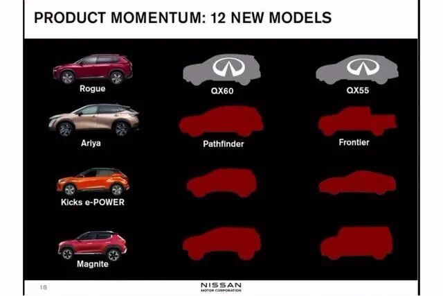 从图上可以看出有我们熟悉的车型日产奇骏(参数|询价)及品牌首款电动SUV Ariya(参数|询价)、小改款劲客(参数|询价)与全新小型跨界SUV Magnite,只是不知引入国内市场要等猴年马月了。