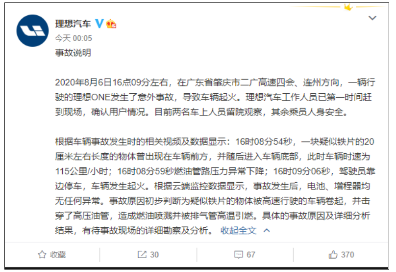2020年8月6日16点09分左右,在广东省肇庆市二广高速四会、连州方向,一辆行驶的理想ONE发生了意外事故,导致车辆起火。