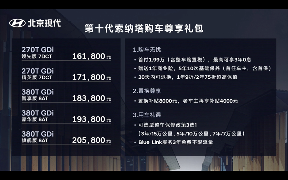 值得关注的是,其1.5T车型售价比之前的预售价格低了3千元,而2.0T有两款车型也比预售价低了两千元。而且,现在买车还送一年商业险、5年10次基础保养,以及8000元的置换补贴等额外福利。看得出,为了快速冲刺销量,北京现代已经拿出了最大的诚意。对于北京现代来说,这是款至关重要的产品。曾经的八代索纳塔在国内有过辉煌,而随后的第九代和九代半却黯然失色,跟凯美瑞(参数|询价)、雅阁(参数|询价)、帕萨特(参数|询价)等对手的距离越拉越大。如今,第十代的出现,自然而然被寄予厚望——索纳塔甚至现代能否重回往日的辉煌,在此一举。不过,对于消费者来说,品牌的生死并不重要。没必要对品牌忠诚,产品谁好用就买谁的。所以第十代索纳塔想要打一个翻身仗,必须凭实力说话。这个时代,多少都要靠脸吃饭第十代索纳塔在外观设计上融合了现代汽车最新的设计理念Sensuous Sportiness(感性运动),对于一款历史悠久的产品,新潮的设计是为了吸引年轻的消费力量。本身来讲,外观美不美是一个见仁见智的问题,没必要过多评价,只能说索纳塔确实从设计上就已经表现出极强的求生欲,努力在向新的主流消费群体示好。这一点在内饰上也有充分体现。双12.3英寸的超大连体双屏,采用了贯穿式的设计。中控台大面积的真皮包裹,这在现代家族中也属于颇为前卫的设计。氛围灯有64色,10档亮度,美感上第十代索纳塔做的很出色。不过,颜值虽然可以影响消费者的购买心理,但想要卷土重来的索纳塔,是必须有强大的产品力支撑的,只靠好看远远不够。皮囊之下,内涵才是核心竞争力作为一款历经十代,在国内累积用户近百万的车,第十代索纳塔为了突破自己,带来了很多亮点。亮点一:数字化智能座舱接着上文的内饰来说,全系标配的中控大屏和全液晶仪表盘连接的设计是同级独有的,而按键式电子换挡也是同级别所不具备的。这不仅是对美观的提升,停车时换挡的便利性和稳定性也得到了改善。在开关车门时,其可自动执行P档,为安全性提供了保障。十代索纳塔用上了JBL高级音响,虽说扬声器只有7颗,效果却不输同级别车的BOSE音响,而且,其使用ARKAMYS顶级音效程序,这是法国空客都搭载的音效程序,能够满足不同人的音效需求。此外。车载的无线充电带下车遗忘提醒,双区空调带PM1.0过滤功能,能够过滤病毒。座椅不仅支持加热,前排座椅还有一个很贴心的座椅通风功能,这在夏日是非常实用的。与百度联手打造的智能网联平台,在智慧车联上也有着不错的表现,让用车生活更便捷。不过,即便智能化的座舱比起颜值实用,配置也很棒,但想要靠他们重回往日辉煌还是不够。亮点二:动力表现第十代索纳塔有2.0T+8AT、1.5T+7DCT两套动力的五种配置,驾驶模式有五种选择。1.5T的CVVD连续可变气门持续期技术是世界首创,该技术可以让发动机性能提升4%、燃油率提升5%、尾气排放量减少12%,并且根据实际情况调整气门开启持续时间,在提供充沛动力的同时控制油耗。1.5T搭载7DCT变速箱,采用电机驱动换挡模块,换挡速度更快,可靠性也更高。94.9%的传动效率能够实现高效的动力传输。而与雅阁1.5T高动力版本的发动机相比,第十代索纳塔虽然有一些差距,但并不明显。2.0T版本使用先进的8AT变速箱,高齿比范围高达7.42,燃油经济性因为轻量化的设计而提高,传递效率达到90.6%。而与大众著名的EA888高功率版本(380TSI)的2.0T发动机相比,索纳塔有着明显的优势——功率和扭矩双双超过大众,只是在日产最新的可变压缩比2.0T超变擎面前落了下风。综上,在动力方面,索纳塔确实有一战之力。面对雅阁和帕萨特两个同级产品,拿得出硬实力。值得一提的是,第十代索纳塔是首次基于i-GMP平台打造的车型,该平台在设计、碰撞、能效、操控和空间方面都有着不错的表现,并不输于丰田的TNGA架构。安全配置安全性能是动力操控之外笔者认为最重要的一点。第十代索纳塔的Hyundai smartSense 智心合一安全系统,搭载了多达23项L2+的智能安全配置。其中,NSCC基于导航智能巡航控制、HDA高速公路驾驶辅助、BCA盲区防碰撞辅助、FCA-JT前方防碰撞辅助-交叉路对向车、SEA安全下车辅助、LVDA前车出发提醒,这几样配置是同级车中独有的。在这些配置的加持下,车辆可以实现在巡航中自动在限速区域、弯道调整车速,与前车保持距离,在0-150km/h速度下都可以自动控制保持车道,在监测到前方有人车或者交叉口时提前预警并制动,且车速低于60km/h可完全制动,后方来车提醒、警报及辅助刹车、后方来车报警并禁止解锁车门等等。这些功能都是同级别凯美瑞和帕萨特所没有,或者不如索纳塔先进的。最后说说总得来看,第十代索纳塔在动力和安全方面的表现算得上突出,而外观内饰设计、智能化配置、车联网功能等加分项也会给这款车带来很大的优势。在日系高歌猛进的今天,能看到一款充满诚意,充分考虑了市场需求的韩系车出现,对于消费者来说是一件好事。当然,北京现代的诚意还体现在价格和销售政策上,对于B级车市场而言,要的就是索纳塔这样的“打破规则者”。有竞争才会涌现更好的产品,希望第十代索纳塔可以成为消费者的一个新的优质选择。版权声明:本文为线外邦独家原创稿件,未经授权请勿转载(部分图片来自网络,如有侵权请联系线外邦)