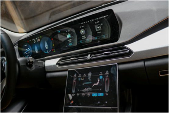 中央娱乐与信息显示屏尺寸同样为12.3英寸,并且支持触控操作与语音操作,内部功能十分丰富,支持多种互联方式,带有原厂百度地图等丰富APP。下方空调控制区同样采用液晶显示屏呈现,支持分屏显示,声音回馈等细节,减少误操作提升实用性。