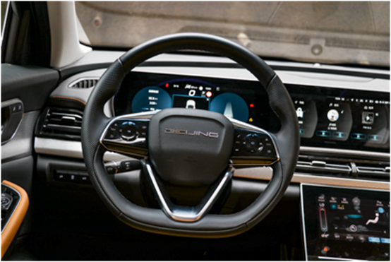 平底式方向盘握感出色,采用皮质包裹,并且带有多功能按键,按键并不只是实体按键,同时还支持触摸与滑动操作,提升使用便利性。