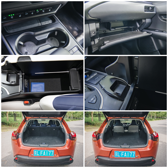 储物空间方面,除前后门把手下面的储物格外,中控台下方带有两个杯架,前面带有一个较深的储物格,可以日常放手机。手套箱内部容积一般,不过带有分层设计,实用性很强。扶手箱采用了双侧开的方式,开口和深度表现都非常出色。后备厢的容积为264L,满足小两口家庭日常使用没有问题,但UX由于后备厢开口较高的原因,拿放东西不太方便。